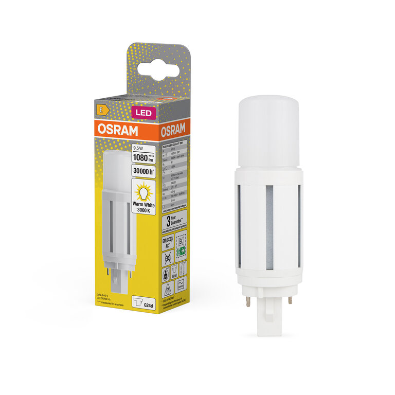 Dank des G24d-Sockels lässt sich die Osram / Ledvance Dulux D Vertikal LED problemlos in bestehende Leuchten einsetzen, die bisher mit Kompaktleuchtstofflampen betrieben wurden. Die LED ist speziell für den Betrieb an konventionellen oder verlustarmen Vorschaltgeräten sowie direkt an Netzspannung ausgelegt, was maximale Flexibilität bei der Installation bietet. Die vertikale Bauform ermöglicht eine optimale Lichtverteilung, selbst in engen oder schwer zugänglichen Leuchten. Durch die 1:1 Austauschbarkeit ist kein Umbau der Leuchte notwendig, was Zeit und Kosten spart.Nachhaltigkeit und Langlebigkeit im Fokus