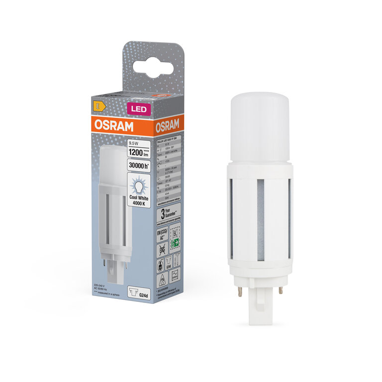 Neben der hohen Energieeffizienz punktet die Osram / Ledvance Dulux D Vertikal LED durch ihre lange Lebensdauer und den geringen Wartungsaufwand. Die LED-Technologie sorgt dafür, dass die Lichtquelle über viele Jahre hinweg zuverlässig arbeitet, ohne an Helligkeit zu verlieren. Das kaltweiße Licht fördert die Konzentration und schafft eine produktive Atmosphäre. Dank der matten Oberfläche wird das Licht angenehm gestreut, was den Sehkomfort zusätzlich erhöht. Die LED ist zudem frei von Quecksilber und anderen schädlichen Stoffen, was sie zu einer umweltfreundlichen Alternative macht.Vorteile: