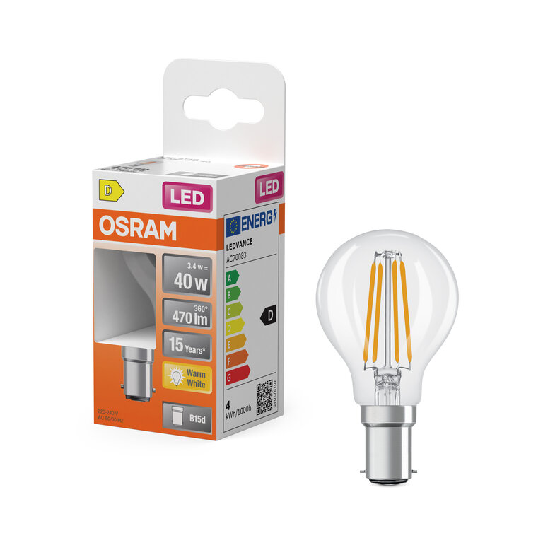 Die Osram / Ledvance Star Tropfen P LED Filament 3.4-40W 827 warmweiß 470lm B15d klar 300° 220-240V vereint klassisches Tropfendesign mit innovativer LED-Filament-Technologie. Durch die klare Ausführung und die filigranen LED-Filamente erinnert dieses Leuchtmittel optisch an traditionelle Lichtquellen, bietet jedoch alle Vorteile moderner LED-Technik. Die Tropfenform eignet sich besonders für dekorative Leuchten, Kronleuchter oder offene Lampenschirme, bei denen das Leuchtmittel sichtbar bleibt und zum stilvollen Ambiente beiträgt.Angenehmes Licht und vielseitige Einsatzmöglichkeiten