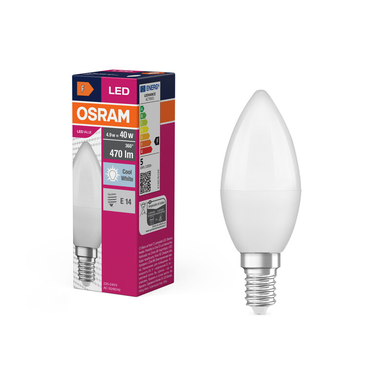Mit einer Leistungsaufnahme von nur 4,9 Watt bietet die Osram / Ledvance Kerze B LED Value eine hervorragende Lichtausbeute und trägt zur Reduzierung der Stromkosten bei. Die LED-Technologie sorgt nicht nur für eine hohe Energieeffizienz, sondern auch für eine lange Lebensdauer, sodass seltener ein Austausch notwendig ist. Das kaltweiße Licht mit einer Farbtemperatur von 4000 Kelvin schafft eine frische und belebende Atmosphäre, die sich besonders für Arbeitsbereiche, Küchen oder moderne Wohnkonzepte eignet. Die matte Oberfläche der LED-Kerze sorgt zudem für eine blendfreie und gleichmäßige Lichtverteilung.Einfache Installation und vielseitige Einsatzmöglichkeiten
