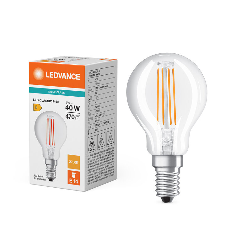 Osram / Ledvance Tropfen P LED Filament Value 4-40W 827 warmweiß 470lm E14 klar 300° 220-240V