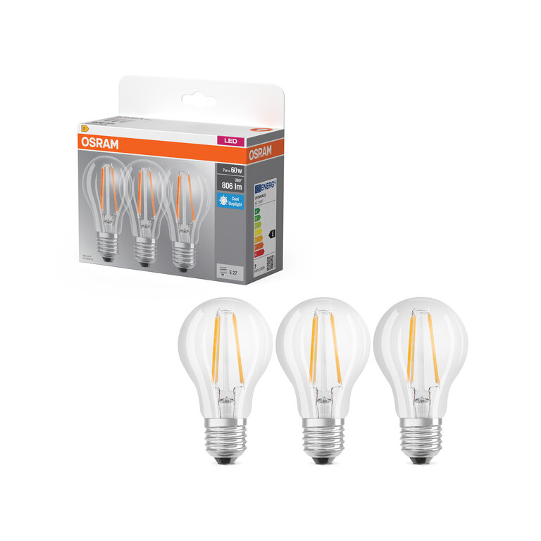 Osram / Ledvance Base Classic A LED Filament 7-60W 865 tageslichtweiß 806lm E27 klar 300° 3er Pack 220-240V